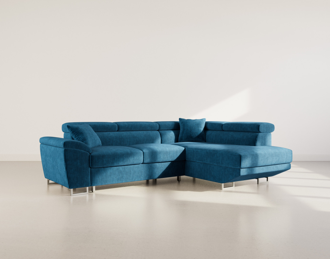 • Canapé d'angle droit 5 places convertible avec têtières et coffre en velours côtelé Baoji
