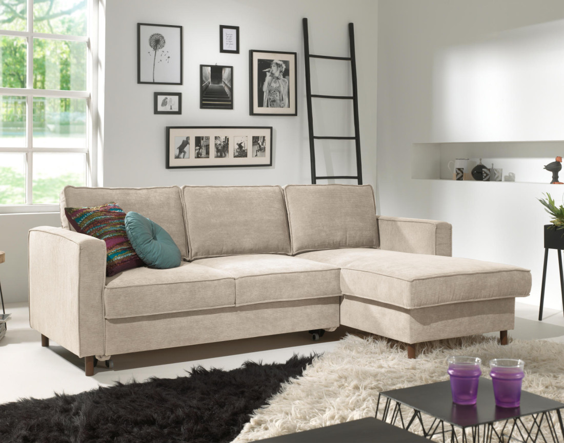 • Canapé d'angle droit convertible avec coffre 4 places en velours côtelé Jake