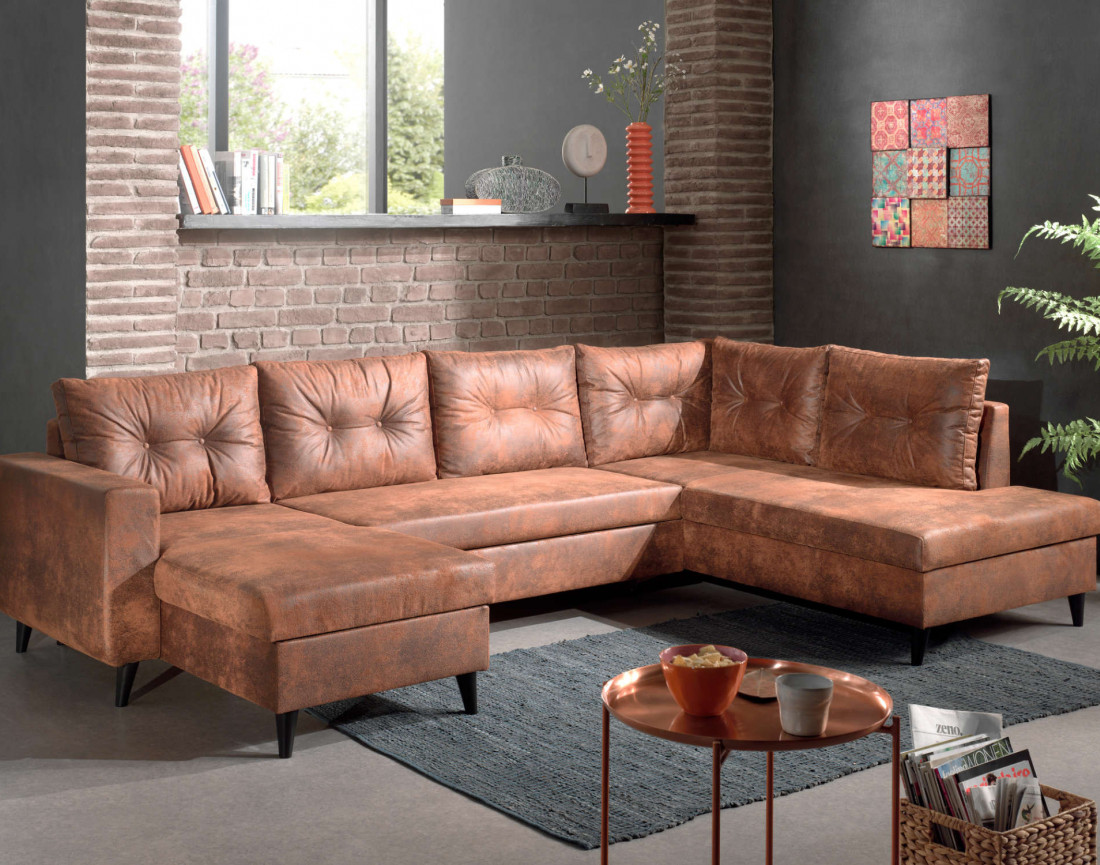 De nos jours, le design industriel vintage est un incontournable de la décoration intérieure. Pour donner un pur style factory ou loft à votre salon, choisissez le canapé panoramique en U 7 places Nordic. Avec ses lignes épurées, son design un peu rétro, ses pieds en bois noirs et son revêtement marron vieilli, il s’installera en toute harmonie devant un mur de briques sur un sol en béton ciré et entouré de quelques caisses en bois. Confortable, le canapé panoramique Nordic indus a un revêtement en microfibre à l’aspect usé mais au toucher doux et agréable.